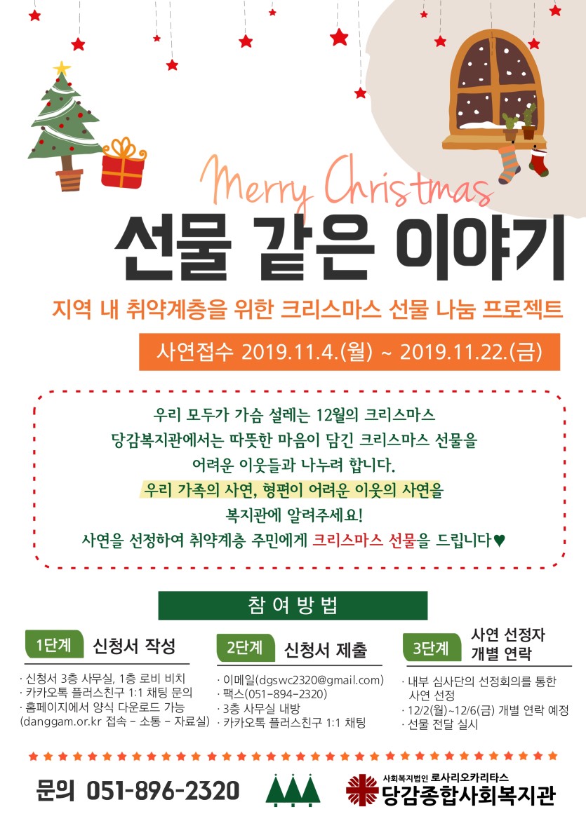 취약계층을 위한 크리스마스 선물 나눔 프로젝트 [선물 같은 이야기]에 참여하세요! 게시글 작성정보 작성자 당감종합사회복지관 작성일 19-11-04 13:24 조회수 2,601 댓글수 0 목록 게시글 본문 신청서 양식은 홈페이지 자료실, 1층 로비, 3층 사무실에 구비되어 있으며, 카카오톡 플러스친구 1:1 채팅을 통해 문의 후 신청서 양식 작성도 가능하십니다.^^ 이전글 2020년도 노인사회활동지원사업 참여자 접수 19-11-22 다음글 아동 무료 독서프로그램 "또박또박 읽어요"의 이용자를 모집합니다. 19-09-09 댓글 0 등록된 댓글이 없습니다. 목록