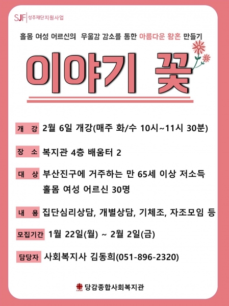 성주재단 지원 - 홀몸 여성 어르신 우울감 감소 지원 프로그램 대상자 모집 게시글 작성정보 작성자 당감종합사회복지관 작성일 18-02-05 21:37 조회수 2,195 댓글수 0 목록 게시글 본문 이전글 사회교육 무료특강 안내 18-02-14 다음글 [부산사회복지공동모금회 지원] 남성 어르신 모임 '청춘! 당감밴드' 회원 모집 18-02-05 댓글 0 등록된 댓글이 없습니다. 목록