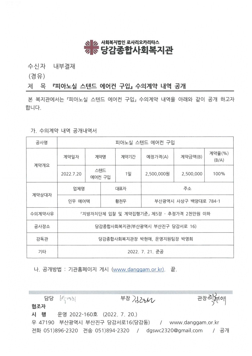 당감종합사회복지관 피아노실 에어컨 구입 수의계약 내역을 별첨과 같이 공개하오니 참고하여 주시기 바랍니다.