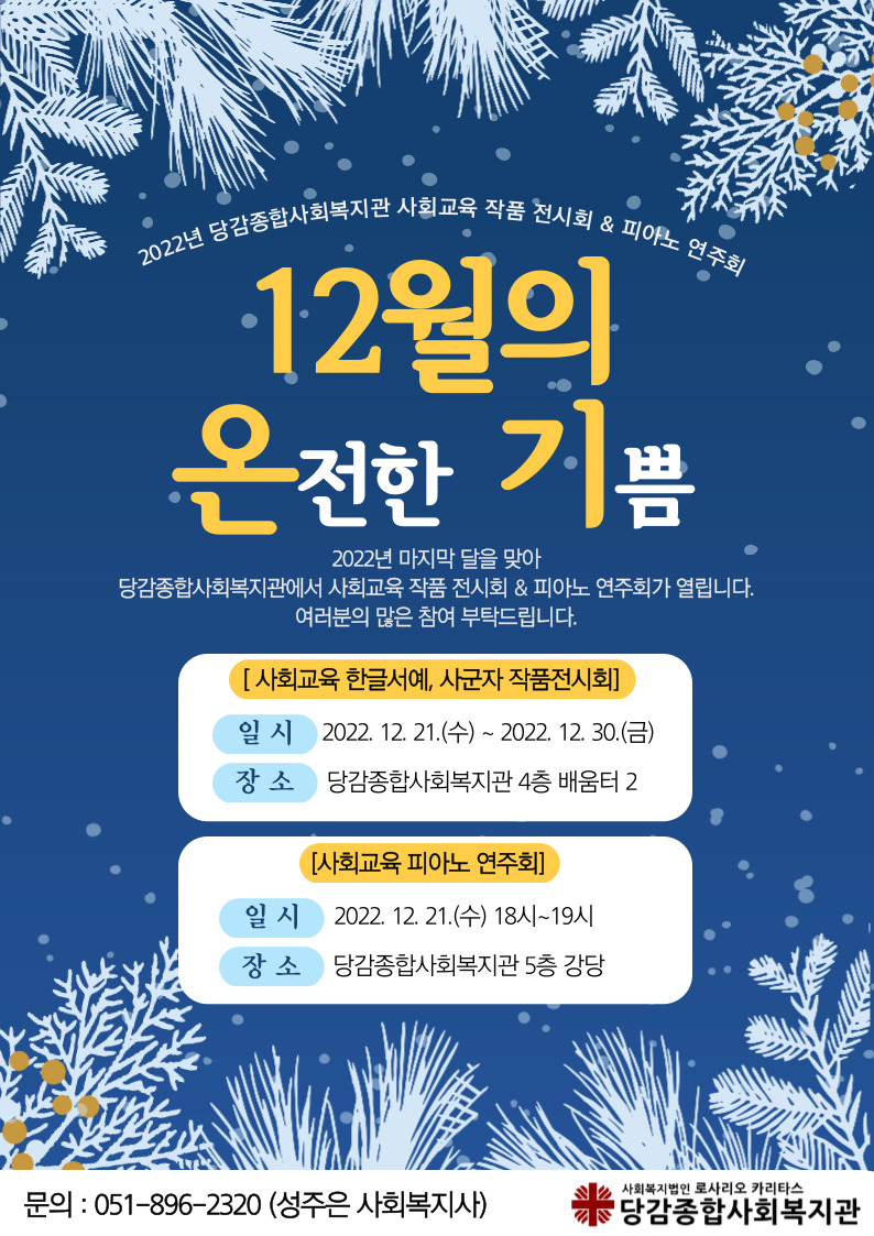 2022년 마지막 달을 맞아 당감종합사회복지관에서 사회교육 작품전시회&피아노 연주회가 진행됩니다.