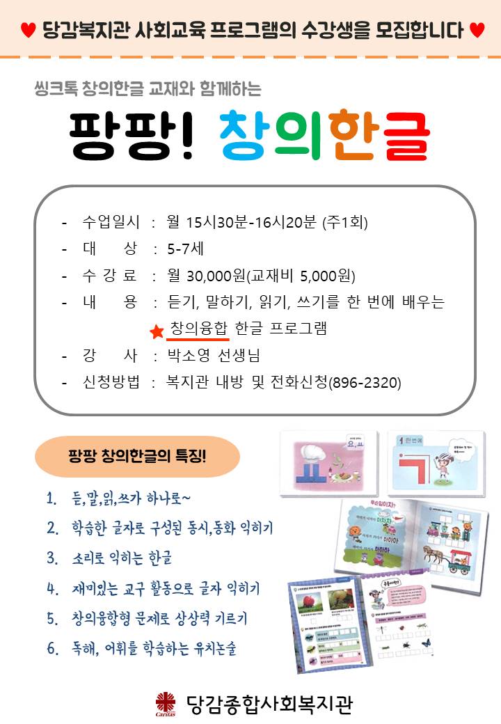 5-7세 아동을 대상으로 하는 '팡팡! 창의한글' 수업의 이용자를 모집합니다.