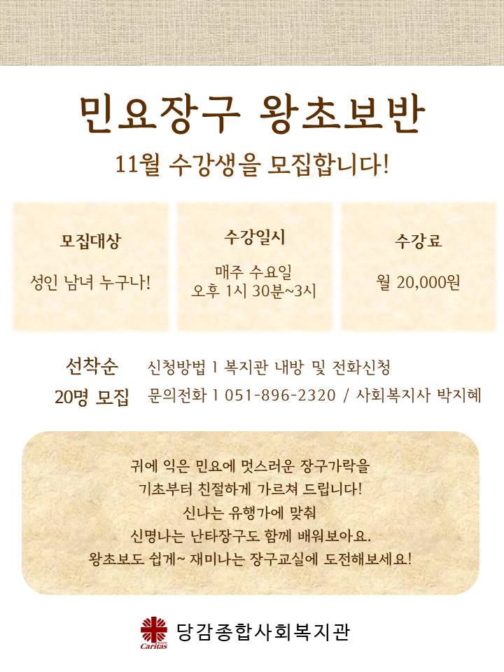 당감복지관의 사회교육 프로그램 '민요장구' 수업의 왕초보반 이용자를 모집합니다.