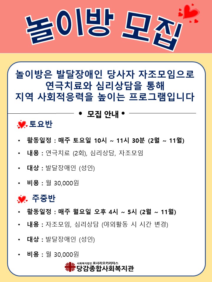 발달장애인 당사자 자조모임 (놀이방) 신규 이용자 모집 게시글 작성정보 작성자 당감종합사회복지관 작성일 19-01-25 13:27 조회수 2,100 댓글수 0 목록 게시글 본문 - 이전글 겨울방학 2월 무료특강 "3D 펜아트 디자인" 19-02-02 다음글 사회교육 겨울방학 무료특강 안내 19-01-07 댓글 0 등록된 댓글이 없습니다. 목록