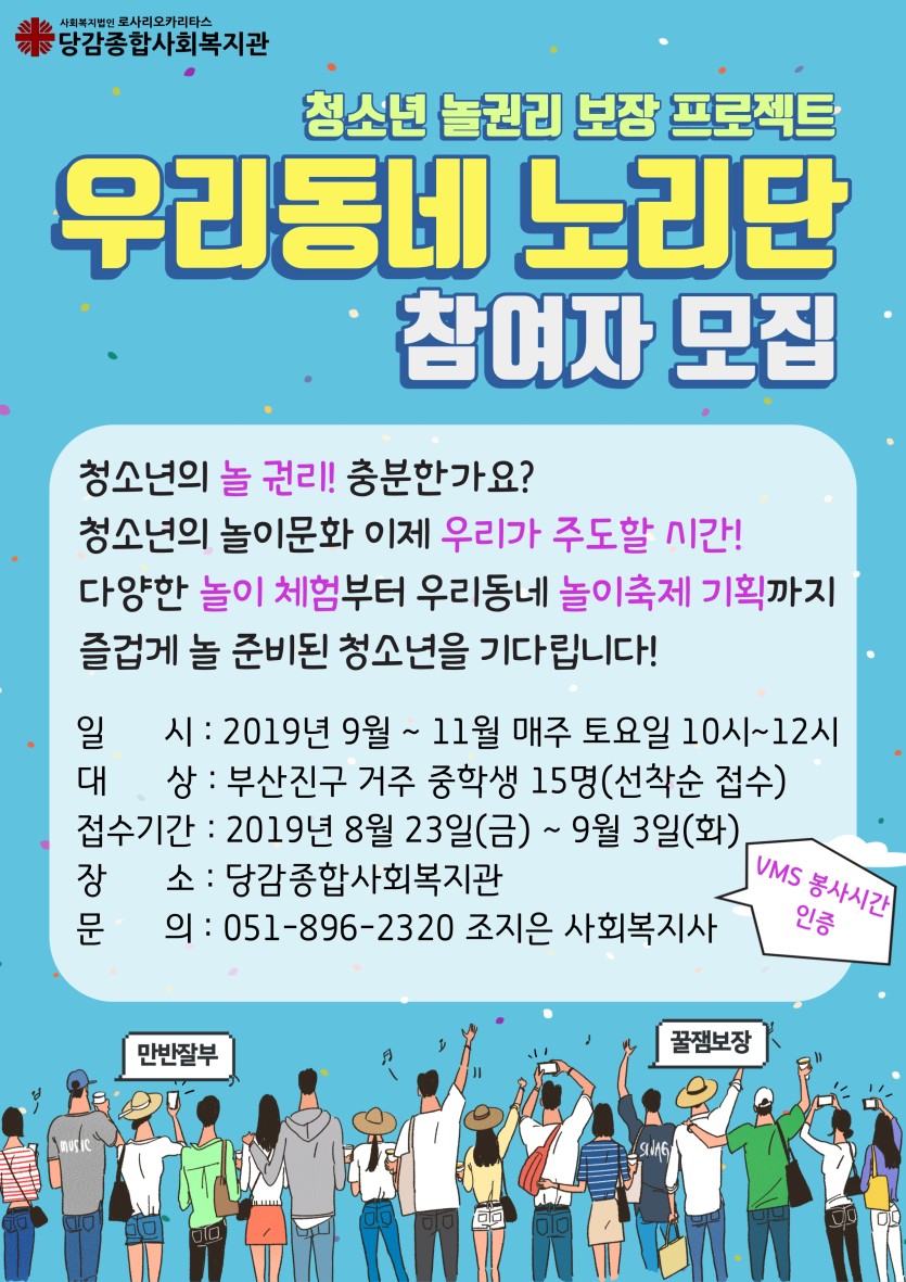 청소년 놀권리 보장 프로젝트 '우리동네 노리단' 참여자 모집 게시글 작성정보 작성자 당감종합사회복지관 작성일 19-08-23 13:32 조회수 2,806 댓글수 0 목록 게시글 본문 이전글 생태복지의 날 ( 플라스틱 사용 줄이기 ) 공모전 및 체험활동 참여자 모집 19-09-06 다음글 2019년 청소년 자원봉사학교 <응답하라 1318> 참여자 모집 19-07-26 댓글 0 등록된 댓글이 없습니다. 목록