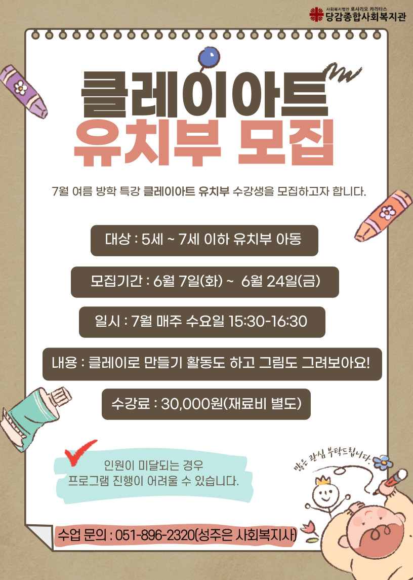 [7월 방학특강] 사회교육 클레이아트 유치부 참여자를 모집합니다.