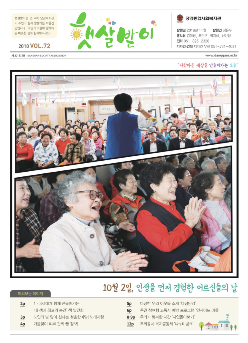 햇살받이 72호 게시글 작성정보 작성자 당감종합사회복지관 작성일 18-11-02 13:46 조회수 2,135 댓글수 0 목록 게시글 본문 첨부파일 1개 당감복지관 마을신문 72호 최종 웹용.pdf (9.2M) 225회 다운로드 첨부일시 : 2018-11-02 13:46:06 이전글 햇살받이 73호 19-01-30 다음글 햇살받이 71호 18-08-09 댓글 0 등록된 댓글이 없습니다. 목록