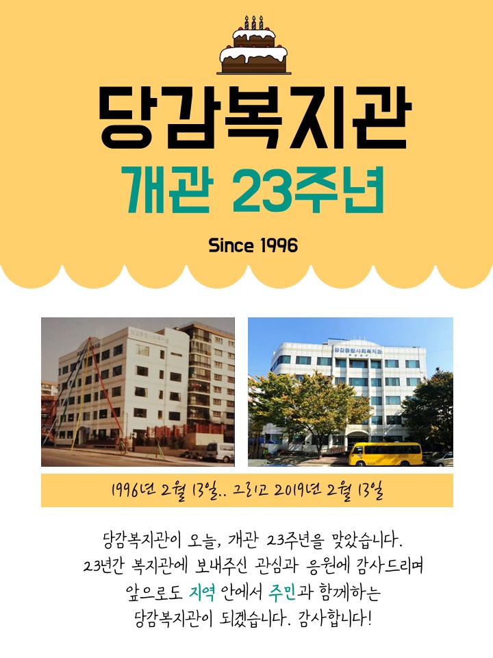 ♥당감복지관 개관 23주년입니다♥ 게시글 작성정보 작성자 당감종합사회복지관 작성일 19-02-13 09:55 조회수 3,352 댓글수 0 목록 게시글 본문 당감복지관의 오늘을, 많이 축하해주세요!^^ 이전글 식자재 업체 공고 입력 오류에 대한 정정 안내 19-02-27 다음글 2019년 노인사회활동지원사업 참여자 모집 19-01-21 댓글 0 등록된 댓글이 없습니다. 목록