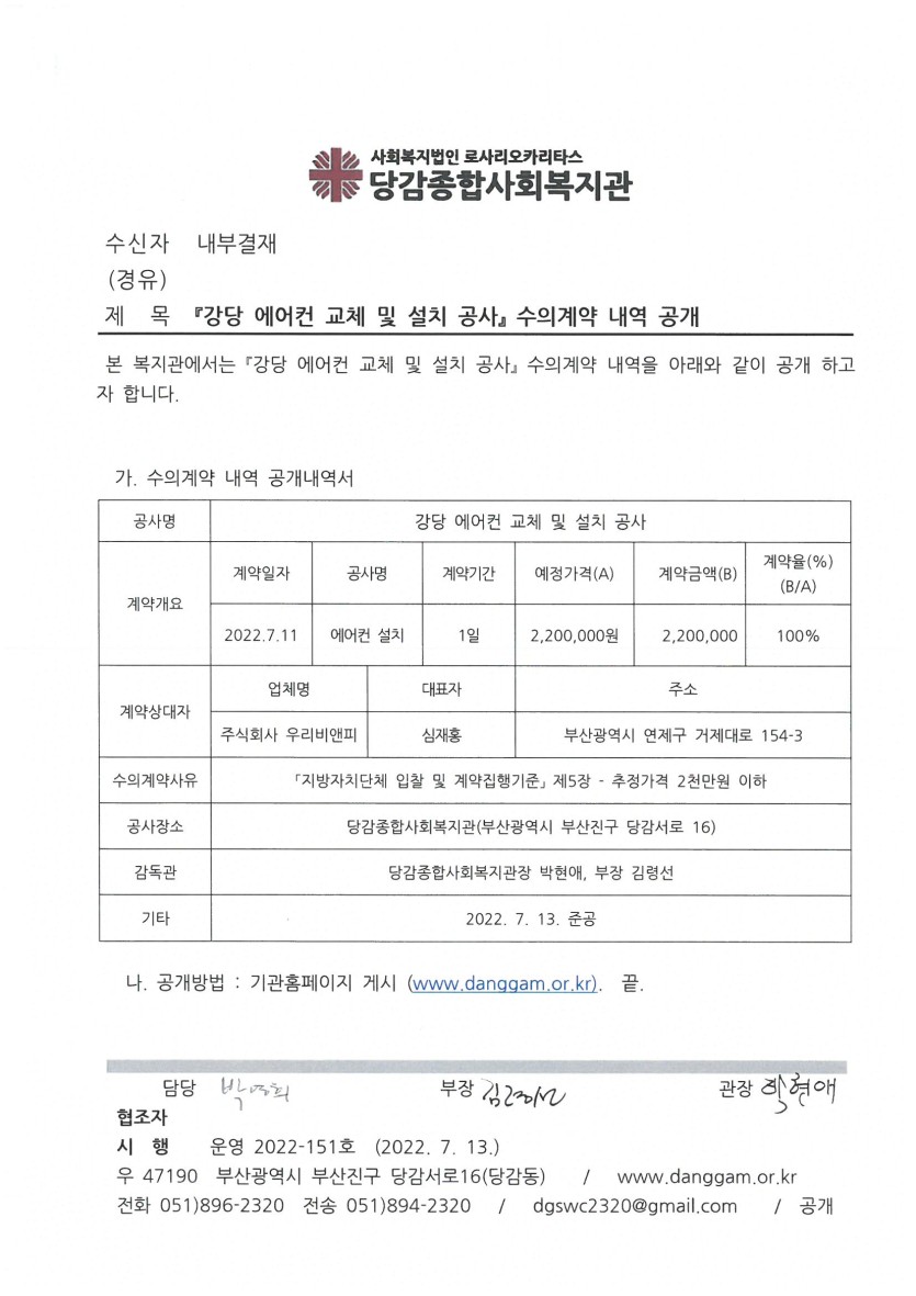 당감종합사회복지관 강당 에어컨 설치작업 수의계약 내용을 별첨과 같이 공개하오니 참조하여 주시기 바랍니다.