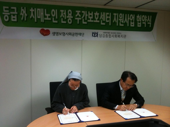 본 기관 지역사회보호사업의 일환으로 진행되고 있는 "장기요양보험 등급외 경증 치매 어르신 주간 보호 프로그램(아름다운 인생)"이 생명보험사회공헌재단(이사장 이시형)에서 지원하는 [등급 外 치매노인 전용 주간보호센터 운영지원사업]에 선정되어 지난 2월 14일(화) 협약을 체결 하였습니다.
