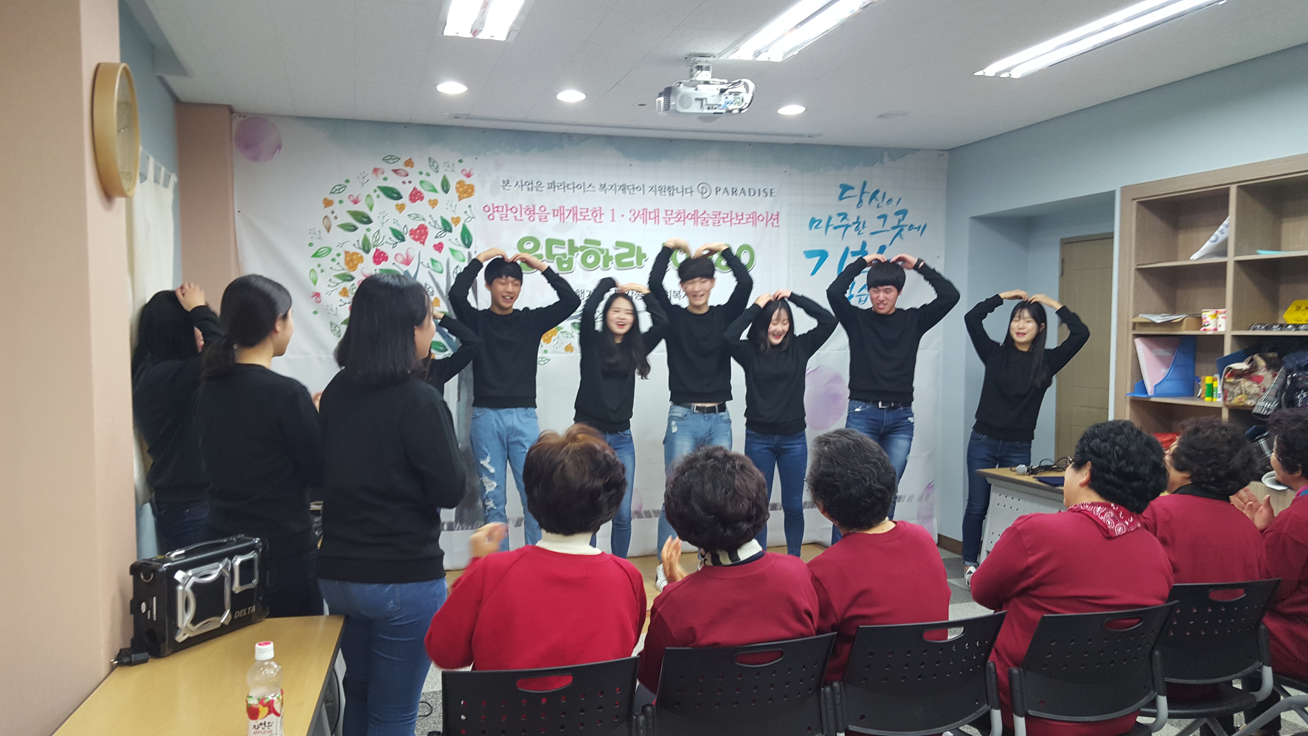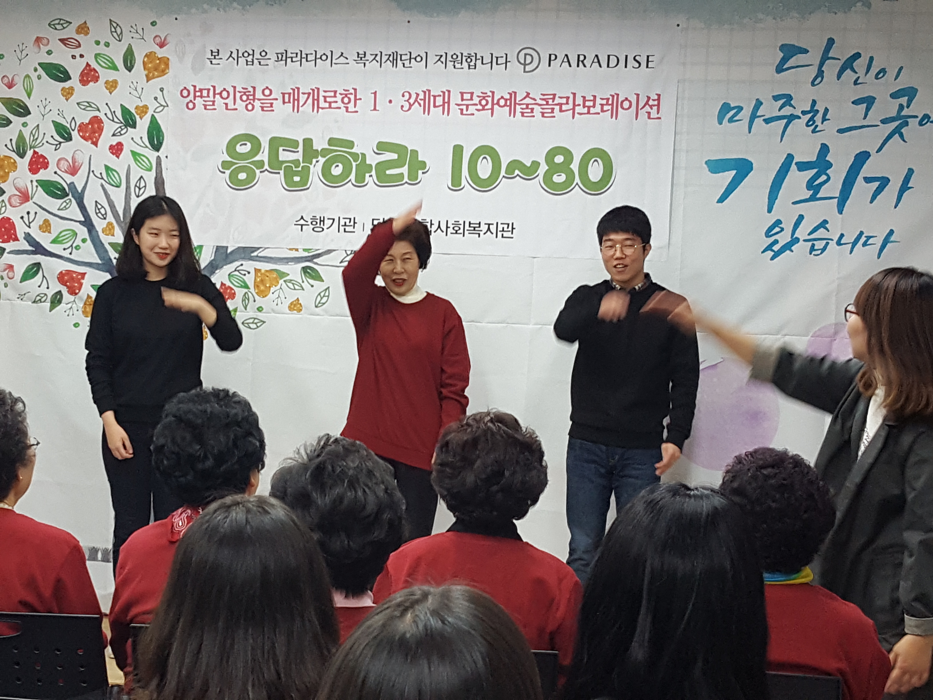 파라다이스 복지재단 지원 1.3세대 문화예술 콜라보레이션 발표회 게시글 작성정보 작성자 당감종합사회복지관 작성일 16-11-18 15:08 조회수 3,110 댓글수 0 목록 게시글 본문 ^^파라다이스 복지재단 지원 1.3세대 문화예술 콜라보레이션 발표회 ~~청소년,대학샘 팀 양말인형 제작 영상 시청할머니 양말인형 소품팀 합창청소년팀 댄스와 노래 공연팜페라 쏘울씽어스의 공연우리동네 기타 동아리 공연1세대에서 3세대 모두가 감동이 있고 문화 공감대가 어우리진 멋진 발표회가 되었답니다. 이전글 삼척복지관 기관방문 16-11-22 다음글 응답하라1080 문화예술 콜라보레이션 발표회 16-11-18 댓글 0 등록된 댓글이 없습니다. 목록