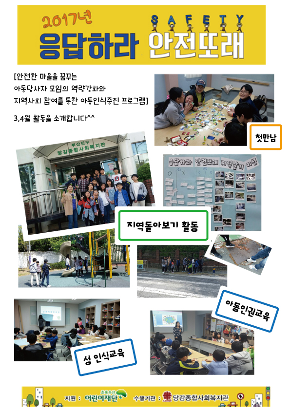 [응답하라 안전또래] 3,4월 활동사진 게시글 작성정보 작성자 당감종합사회복지관 작성일 17-05-07 22:06 조회수 2,833 댓글수 0 목록 게시글 본문 진행장소 : 당감본동 행복마루 프로그램실 및 지역내 당당자 : 사회복지사 김령선 이전글 *4월 사랑의 저금통 나누미* 17-05-10 다음글 사랑의 저금통이 복지관으로 돌아왔어요 17-04-25 댓글 0 등록된 댓글이 없습니다. 목록