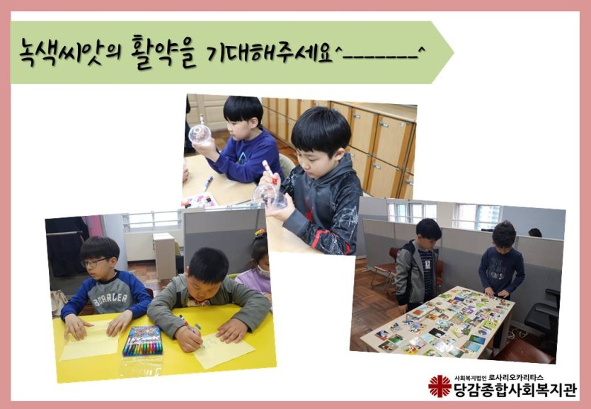 2019년 친환경 실천 동아리 <녹색씨앗> 게시글 작성정보 작성자 당감종합사회복지관 작성일 19-05-16 17:48 조회수 2,984 댓글수 0 목록 게시글 본문 이전글 사랑을 전달하는 2019년 어버이날 선물 드리기 19-05-21 다음글 바자회, 그 후 19-05-08 댓글 0 등록된 댓글이 없습니다. 목록